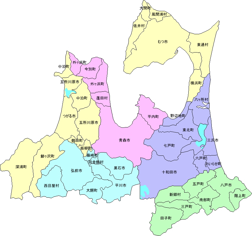 青森市|弘前市|八戸市|黒石市|五所川原市|十和田市|三沢市|むつ市|つがる市|平川市|平内町|今別町|蓬田村|外ヶ浜町|鰺ヶ沢町|深浦町|西目屋村|藤崎町|大鰐町|田舎館村|板柳町|鶴田町|中泊町|野辺地町|七戸町|六戸町|横浜町|東北町|六ヶ所村|おいらせ町|大間町|東通村|風間浦村|佐井村