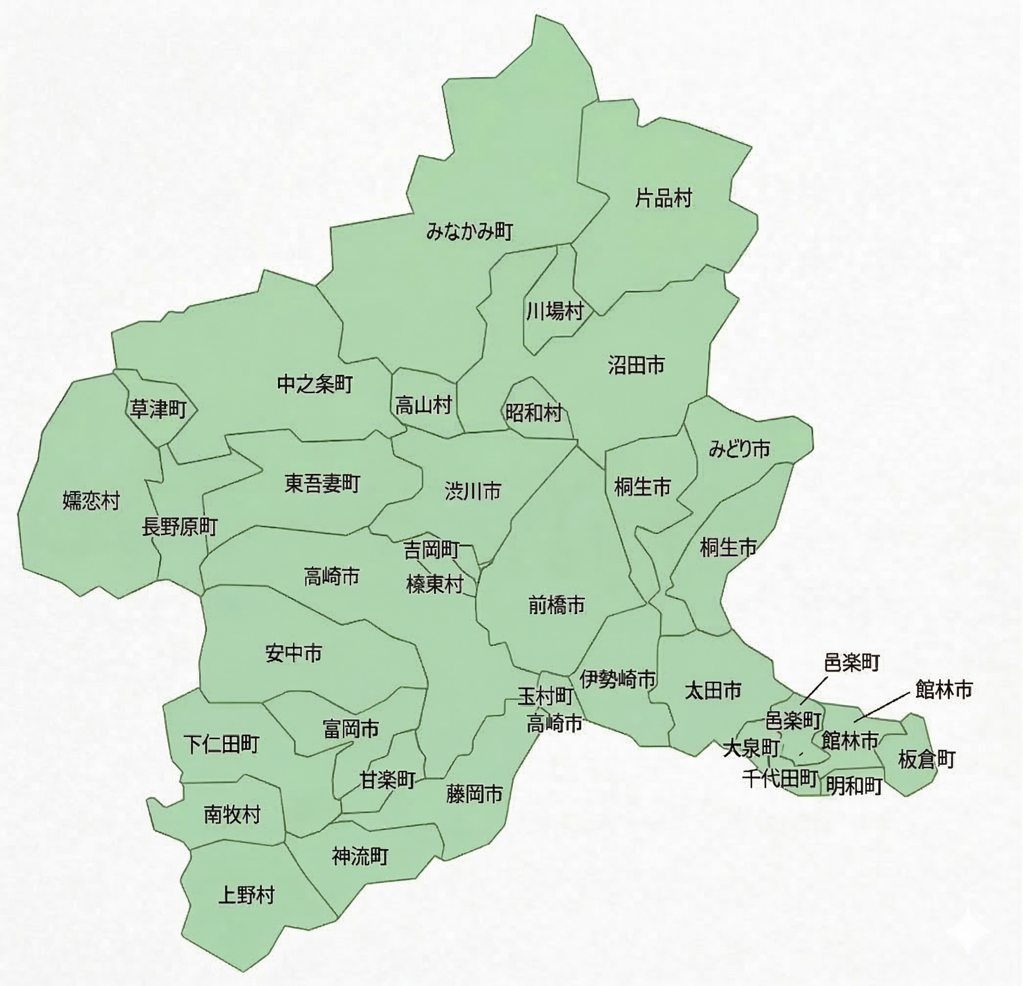 前橋市|高崎市|桐生市|伊勢崎市|太田市|沼田市|館林市|渋川市|藤岡市|富岡市|安中市|みどり市|榛東村|吉岡町|上野村|神流町|下仁田町|南牧村|甘楽町|中之条町|長野原町|嬬恋村|草津町|高山村|東吾妻町|片品村|川場村|昭和村|みなかみ町|玉村町|板倉町|明和町|千代田町|大泉町|邑楽町