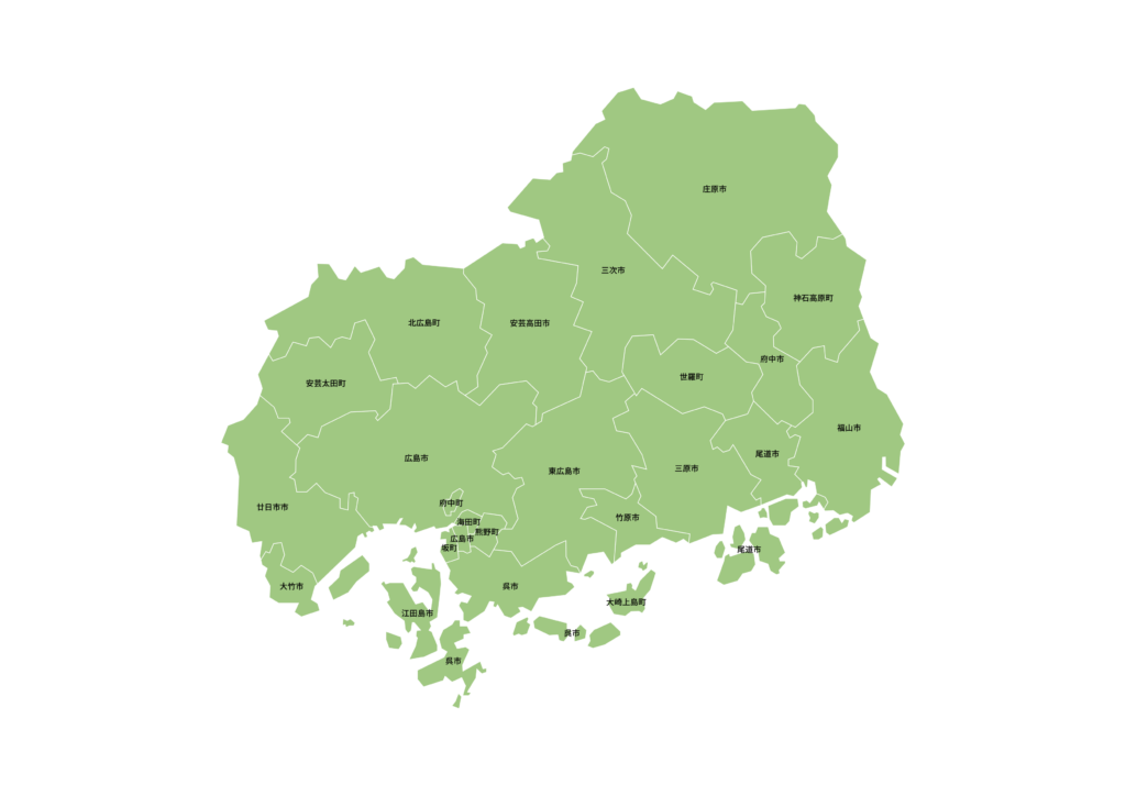 広島市|呉市|竹原市|三原市|尾道市|福山市|府中市|三次市|庄原市|大竹市|東広島市|廿日市市|安芸高田市|江田島市|府中町|海田町|熊野町|坂町|安芸太田町|北広島町|大崎上島町|世羅町|神石高原町