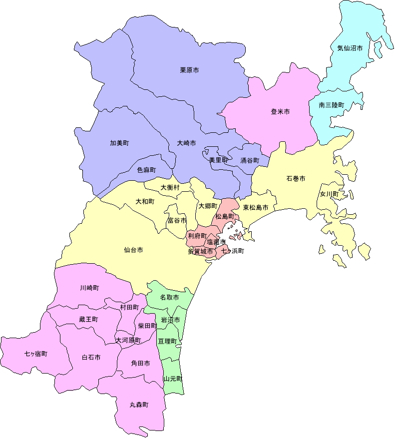 仙台市|石巻市|塩竈市|気仙沼市|白石市|名取市|角田市|多賀城市|岩沼市|登米市|栗原市|東松島市|大崎市|蔵王町|七ヶ宿町|大河原町|村田町|柴田町|川崎町|丸森町|亘理町|山元町|松島町|七ヶ浜町|利府町|大和町|大郷町|富谷市|大衡村|色麻町|加美町|涌谷町|美里町|南三陸町