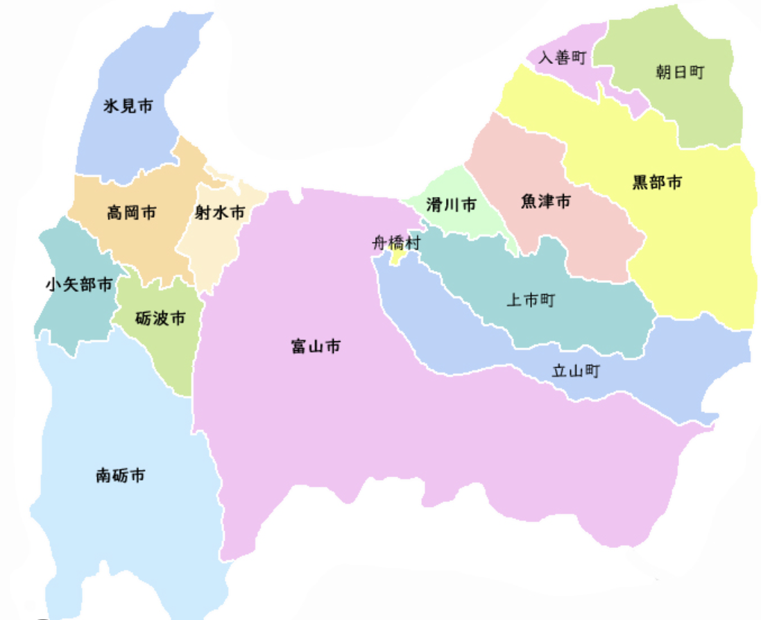 富山市|高岡市|魚津市|氷見市|滑川市|黒部市|砺波市|小矢部市|南砺市|射水市|舟橋村|上市町|立山町|入善町|朝日町