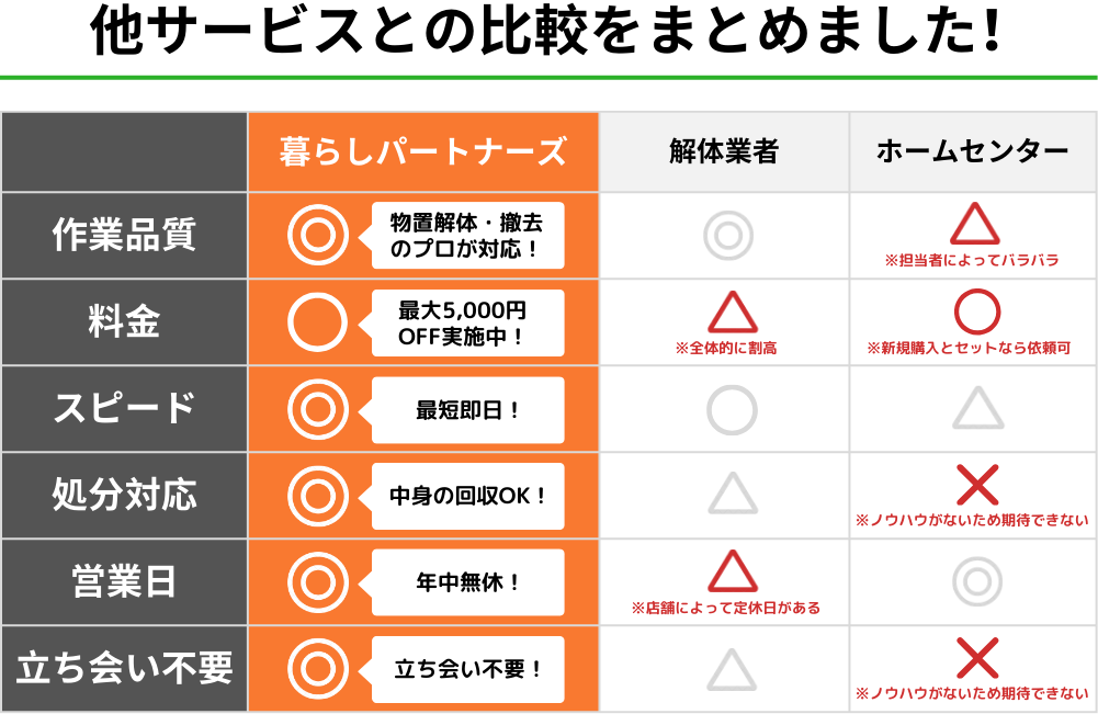 こちらの都合で急に連絡したのですが、すぐに来てくれて丁寧に撤去してくれました。ついでに不用品の回収もお願いできて大変助かりました!周りで困ってる人にぜひ紹介したいと思います。