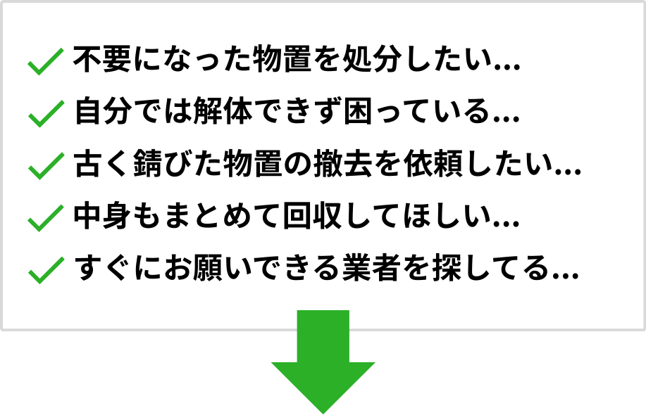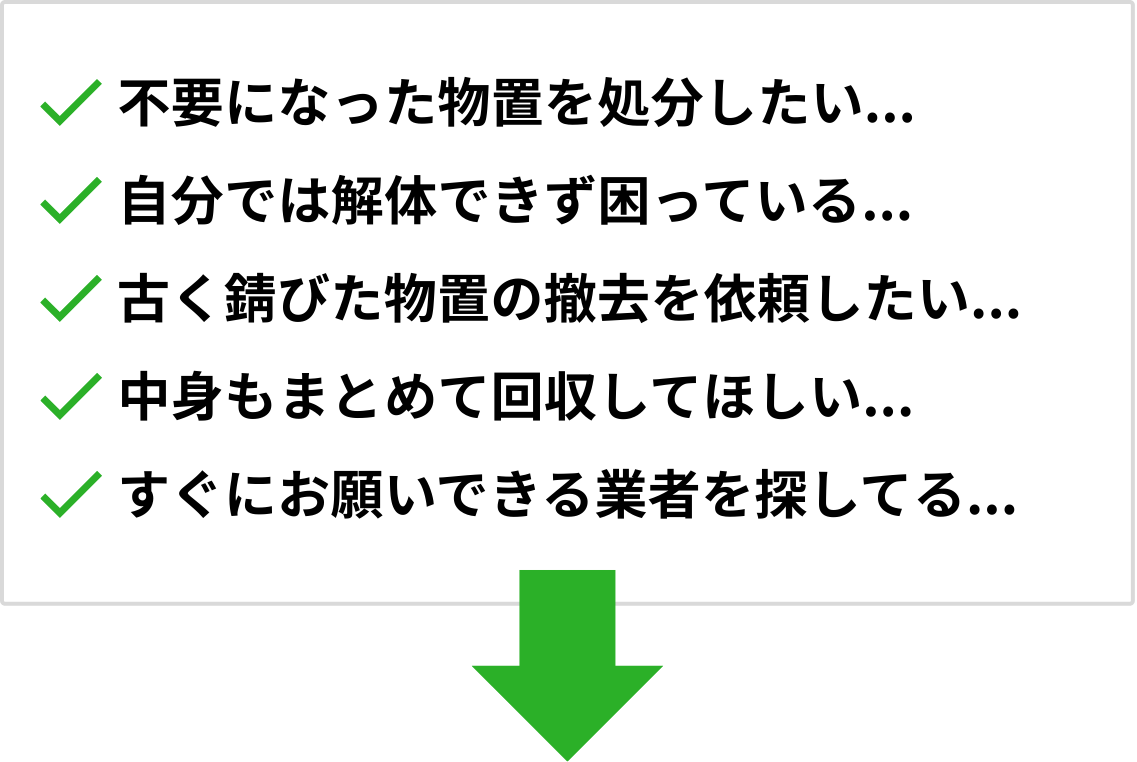 当社は、物置の解体処分業者として、どんな場所、材質でも安全に撤去いたしますので、ぜひ一度ご相談ください。