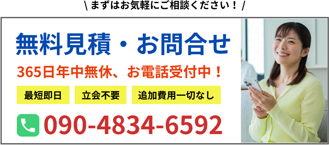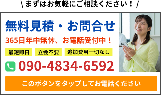 お電話(090-4834-6592)LINEからお問合せを年中無休で受け付けております。まずはお気軽にご相談ください。