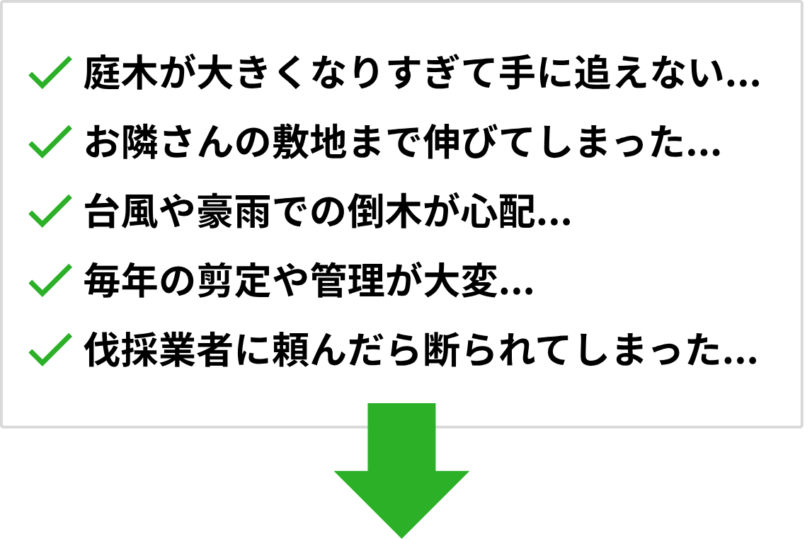 でも、もう大丈夫。庭木伐採・抜根のプロである私たちが、最短即日でスッキリ綺麗に作業いたします。