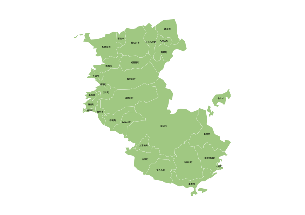 和歌山市|海南市|橋本市|有田市|御坊市|田辺市|新宮市|紀の川市|岩出市|紀美野町|かつらぎ町|九度山町|高野町|湯浅町|広川町|有田川町|美浜町|日高町|由良町|印南町|みなべ町|日高川町|白浜町|上富田町|すさみ町|那智勝浦町|太地町|古座川町|北山村|串本町